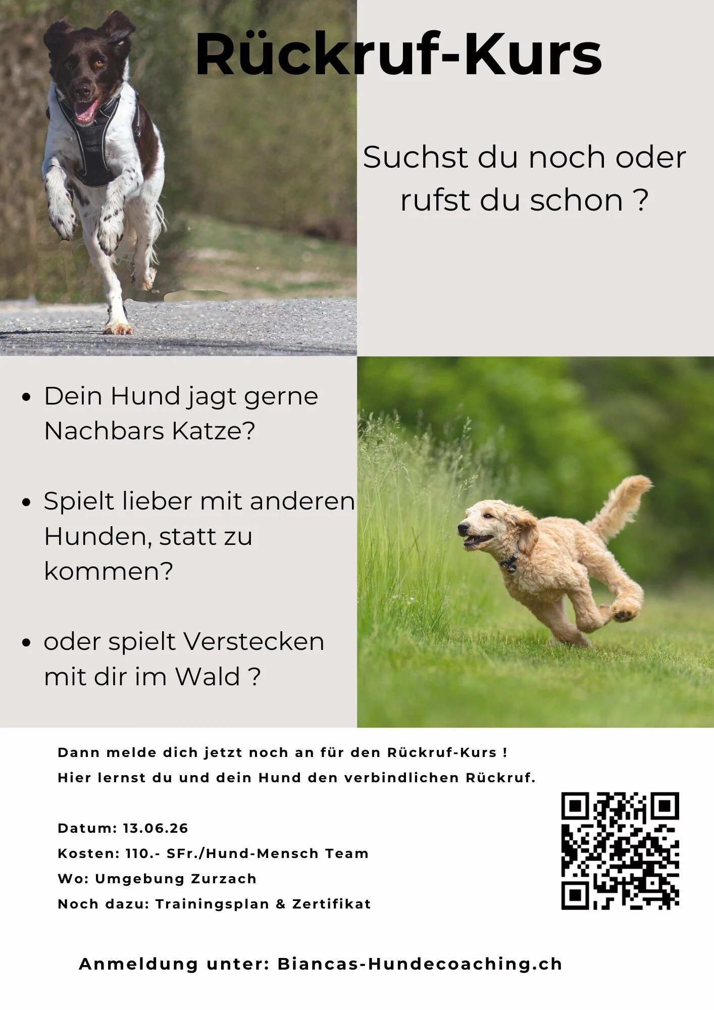 In diesem Kurs lernen du und dein Hund, wie Rückruf zuverlässig funktioniert – Schritt für Schritt und von Anfang an richtig aufgebaut.